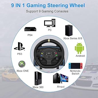 - 【9 IN 1 Racing Wheel】DOYO gaming steering wheel is perfectly compatible with PC, Xbox ONE, Xbox Series X/S, Xbox 360, PS4, PS3, Nintendo Switch, Android and Xinput systems. One machine, multiple platforms, nine in one to play almost all racing games and truck simulators. 7-speed push-down gear, portable and stable, brings the real experience of analog racing (XBOX platform requires the original controller and data cable to guide)
