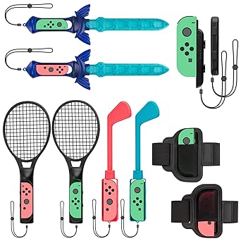 - Package include: 2 x Mario golf clubs, 2 x tennis rackets, 2 x wrist bands, 2 x leg straps, 2 x joy-con grips. Note: Switch Sports Accessories Bundle only, Switch and Switch Jon-Con do not include