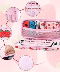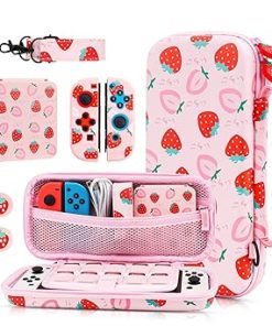 - šćA Perfect Gift for Switch UsersćThe pink strawberry pattern looks really cute and attractive, this storage bag case for Nintendo Switch & Switch OLED adds more vitality to your switch, which is suitable for girls or women. If you have families or friends playing switch, it is very suitable to send them this accessory protective case set as a gift on Christmas, Halloween, Thanksgiving, birthdays, etc, I believe they will be very happy to receive it.