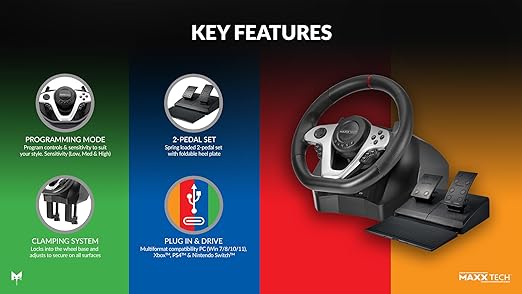 Experience immersive racing with the Maxx Tech PR279 Wheel Kit! Compatible with PC, Xbox, PS4, and Switch. Order now for the ultimate thrill!