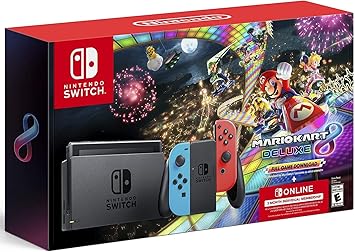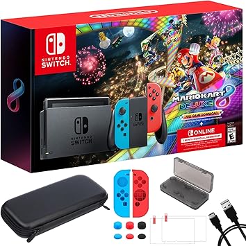 - What’s included: Switch console, Switch dock, Joy-Con (L) and Joy-Con (R), Joy-Con grip, AC adapter, HDMI cable, and 2 Joy-Con strap accessories, Mario Kart 8 Deluxe, and a Nintendo Switch Online 3-Month Individual Membership.