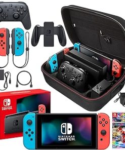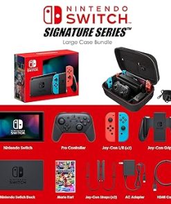 - BUNDLE INCLUDES: Nintendo Switch with Neon Blue/Red Joy-Con, Switch Dock, AC Adapter, HDMI Cable, Joy-Con Grip. Joy-Con Straps, Nintendo Switch Pro Controller, Extra Joy-Con Pair – Neon Red/Blue, Mario Kart 8 Deluxe, Signature Series Nintendo Switch Large Carry Case, and Signature Series Earphones