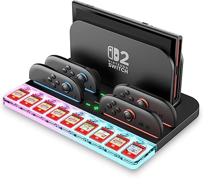 - [Sleek Desktop Aesthetics]: Compact, all-in-one multi-functional design saves space while elevating your desktop style. Doubles as a charger and a display stand for your gaming gear.Storage solution holds 9 game cards, 4 controllers, and 1 Nintendo Switch 2 official Dock. Non-slip rubber pads are included on the bottom for stability.