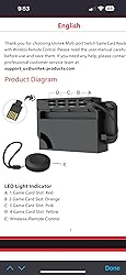 - 【Attention】Our game card reader and remote control are pre-paired before leaving the factory. If the wireless remote control isn’t working with the game card reader, please first make sure to disconnect the power cable from the card reader, then hold down the “switch” button until the USB C power cable is connected and the LED light turns yellow. Next, hold down the remote control for 2s. Once the LED light on the game card reader turns green, it means the pairing successful.