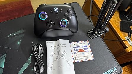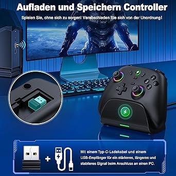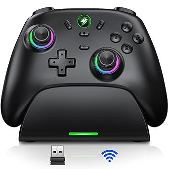 - Long-Lasting Power and Convenient Charging: The controller features a 1000mAh battery, providing over 12 hours of uninterrupted playtime even with lighting activated. It charges in just 3 hours with the included USB Type-C cable. Plus, the convenient wake-up function ensures you’re always ready to play by reconnecting with a simple press of the “HOME” button. A charging base is also included, making storage and charging quick and easy.